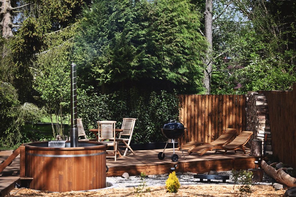 The outdoor sauna and wooden bath barrel perfectly relax your body and mind.